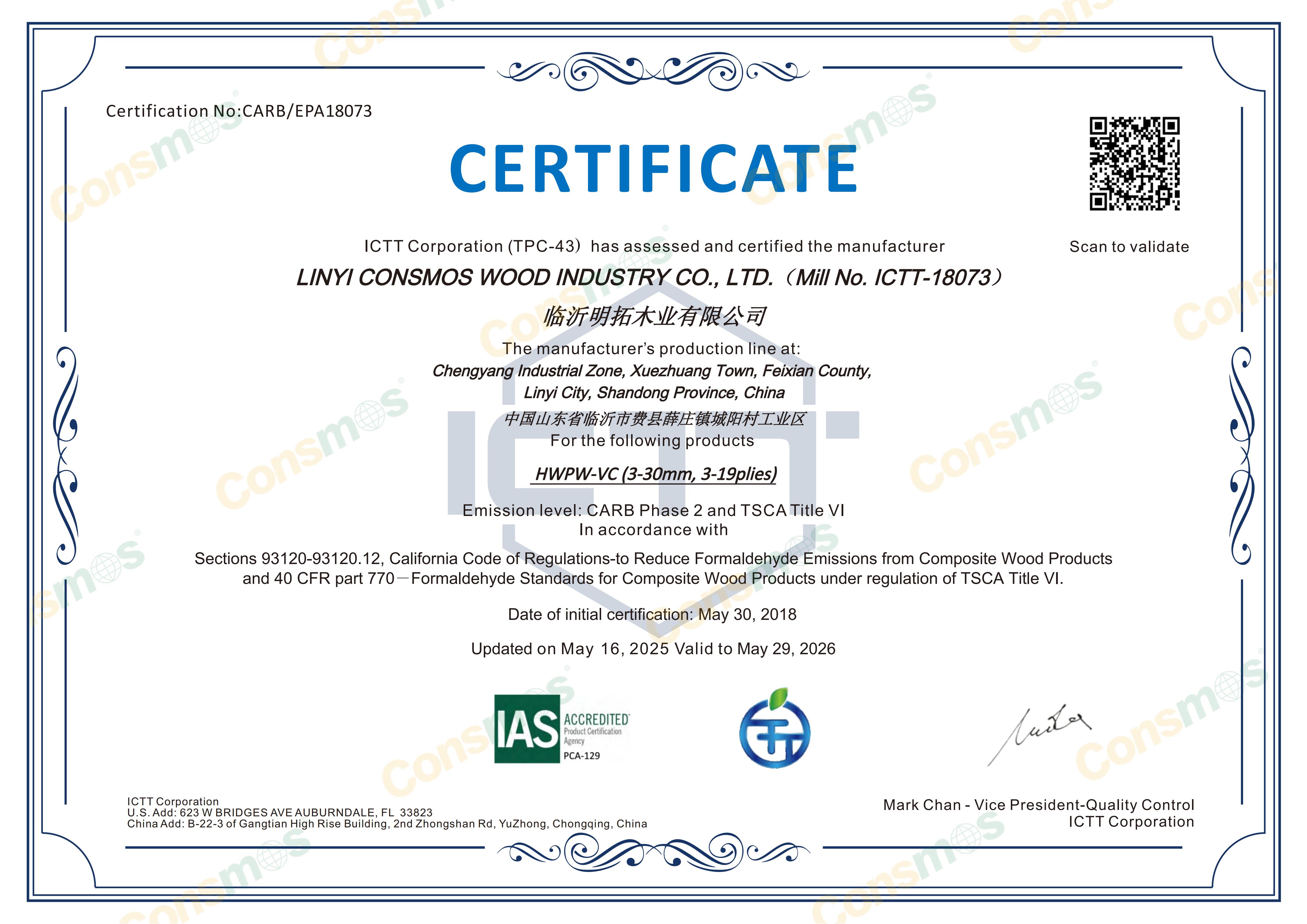 明拓木业与国际接轨,产品通过了国际最严格的板材行业检测,达到德国EPH测试机构的标准CE认证,EUTR认证,美国CARB 认证,美国EPA认证,FSC森林认证,SGS检测认证等。