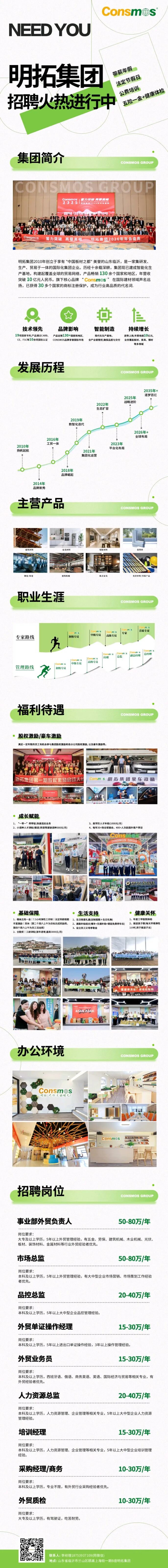 CONSMOS明拓集团,成立于2010年,是以板材研发、生产、进出口贸易和服务为主业的多元化集团公司。集团专注于为全球市场提供优质的产品和服务,立志于打造全球板材供应商第一品牌。公司秉持诚信规范,长久共赢的文化理念,诚邀优秀人才加盟。
